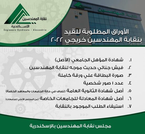 وأعلن مجلس نقابة المهندسين بالإسكندية، عن الأوراق المطلوبة للقيد بنقابة المهندسين لخريجي عام 2022 وجاءت الأوراق على النحو التالي..