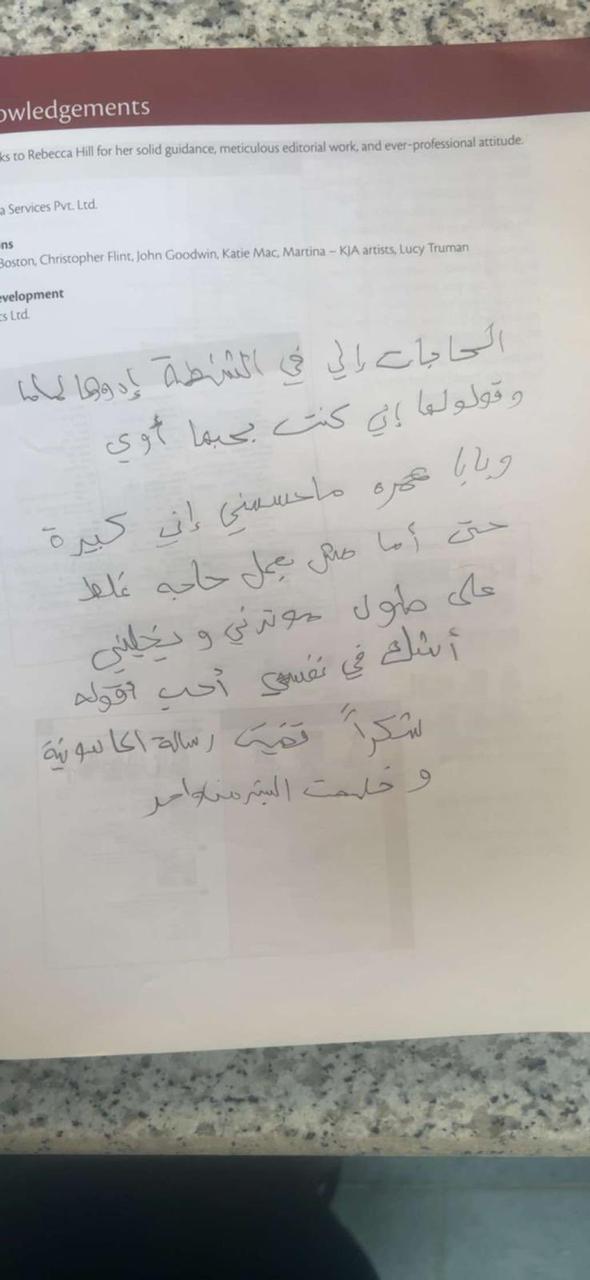 وفي رسالة مكتوبة منسوبة للطالبة المتوفاة، قالت فيها: "الحاجات اللي في الشنط إدوها لماما وقولولها إني كنت بحبها أوي.. وبابا عمره ما حسني إن كبيرة حتى أما مش بعمل حاجة غلط.. على طول موترني ويخليني أشك في نفسي.. أحب أقوله شكرًا قضيت رسالة الماسونية وخلصت البشر من واحد.