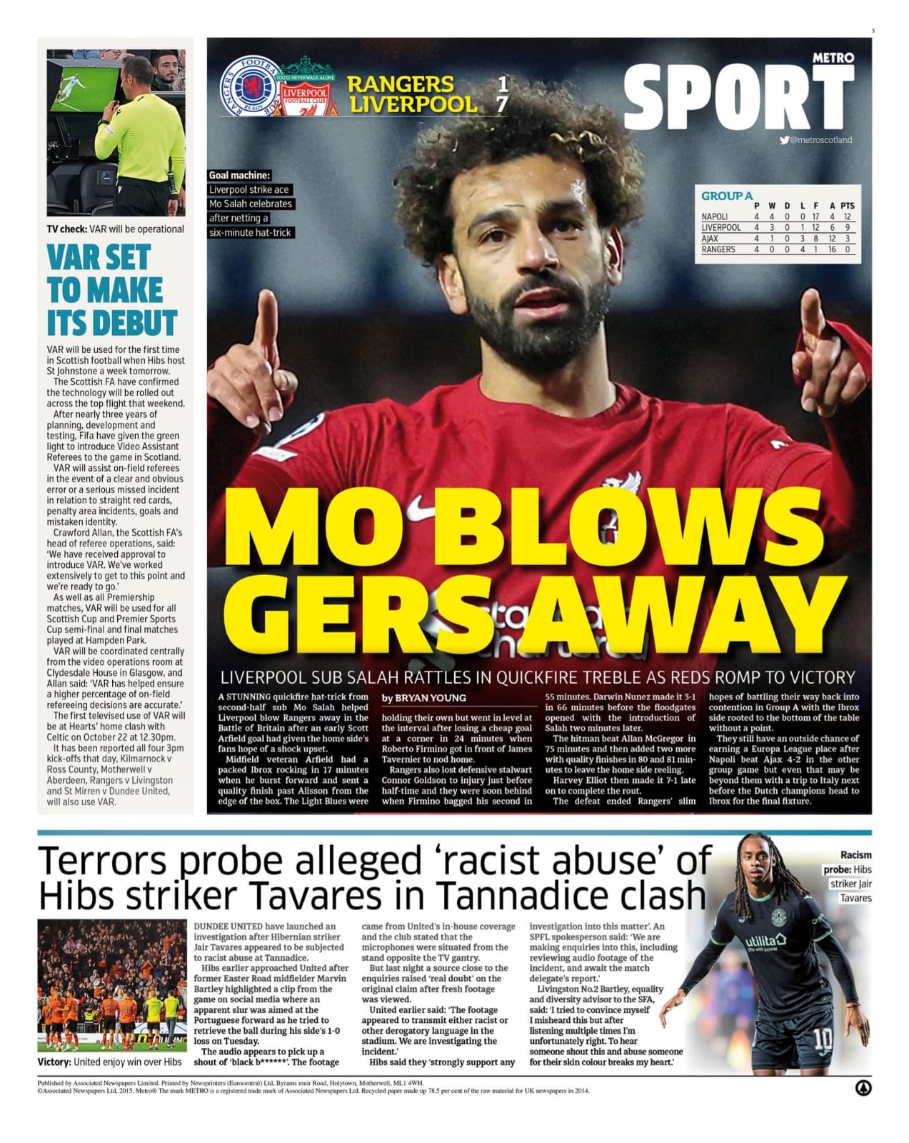 عنونت صحيفة ديلي ميل البريطانية قائله: محمد صلاح بضرب رينجرز الاسكتلندي بتسجيل هاتريك في 6 دقائق، بالإضافة إلى تسجيله أسرع هاتريك في دوري أبطال أوروبا، كما وضع الدولي المصري نادي ليفربول على حافة الأدوار الإقصائية.