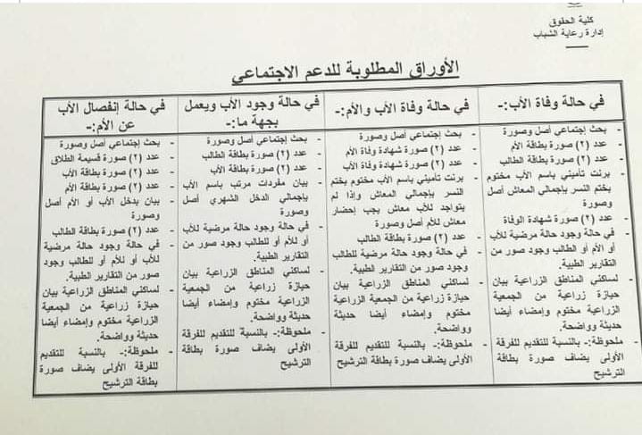 وينشر القاهرة 24 المستندات المطلوبة للحصول على الدعم الاجتماعي للطلاب المستحقين بـ كلية الحقوق جامعة القاهرة في السطور التالية، حتى يجهزوها ويسلموها إلى إدارة رعاية الشباب ليحصوا على الدعم، حيث جاءت المستندات المطلوبة كالتالي: