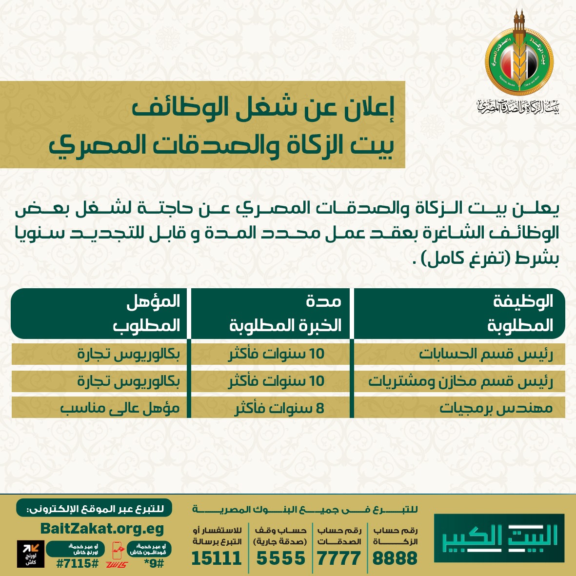 أعلن بيت الزكاة والصدقات تحت إشراف شيخ الأزهر الأستاذ الدكتور أحمد الطيب، عن حاجته لشغل بعض الوظائف الشاغرة في بعض القطاعات.