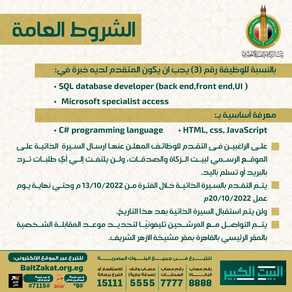ووفقا لما أعلنه بيت الزكاة والصدقات، فإن الوظائف المتاحة في قطاعات الحسابات والمخازن والمشتريات والبرمجيات، ويتاح التقديم لهذه الوظائف بدءا من 13 وحتى 20 أكتوبر الحالي.