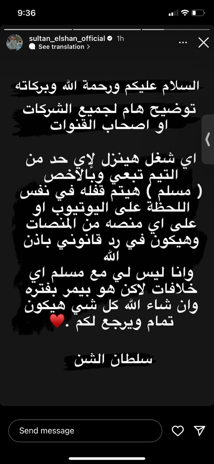 وكتب سلطان الشن، عبر حسابه على موقع إنستجرام: توضيح هام لجميع الشركات وأصحاب القنوات أي شغل هينزل لأي حد من الفريق تبعي وبالأخص مسلم هيتم قفله في نفس اللحظة على يوتيوب أو أي منصة من المنصات وهيكون فيه رد قانوني.