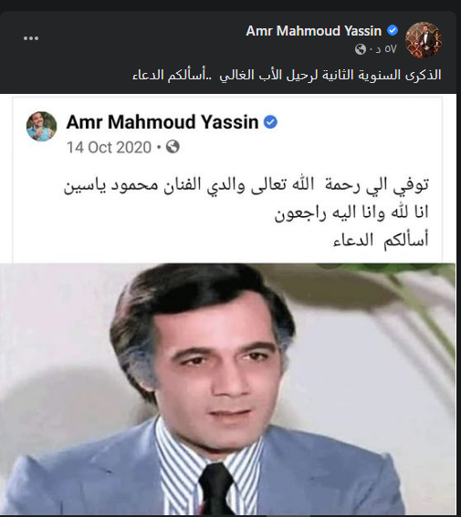 ونشر السيناريست عمرو محمود ياسين، ابن الفنان الراحل محمود ياسين، صورة لوالده، وذلك من خلال حسابه الشخصي بموقع التواصل الاجتماعي فيس بوك، قائلًا: الذكرى السنوية الثانية لرحيل الأب الغالي.. أسألكم الدعاء.