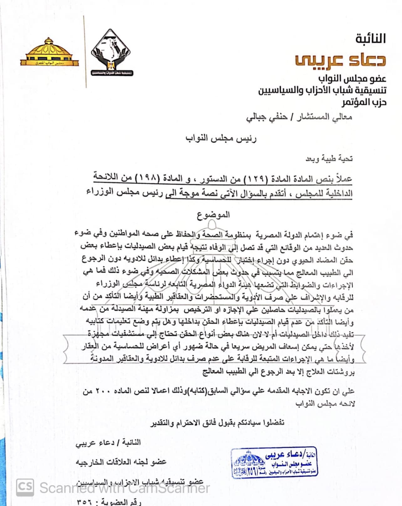 تقدمت النائبة، دعاء عريبي، عضو مجلس النواب، عن تنسيقية شباب الأحزاب والسياسيين، بسؤال برلماني موجهًا إلى رئيس مجلس الوزراء، الدكتور مصطفى مدبولي، ووزير الصحة والسكان، الدكتور خالد عبد الغفار، وذلك بشأن قيام بعض الصيدليات بإعطاء بعض حقن المضاد الحيوي دون إجراء اختبار للحساسية وكذا إعطاء بدائل للأدوية دون الرجوع إلى الطبيب المعالج مما يتسبب في حدوث بعض المشكلات الصحية.