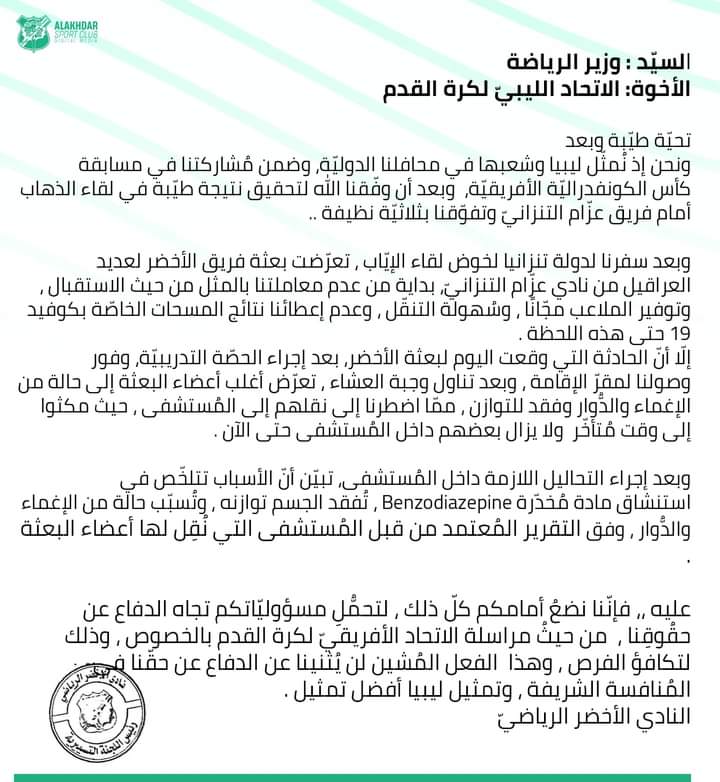 ونشر النادي الليبي مساء أمس بيانًا رسميًا يعلن تعرض بعثته للتخدير، وجاء البيان كالتالي: