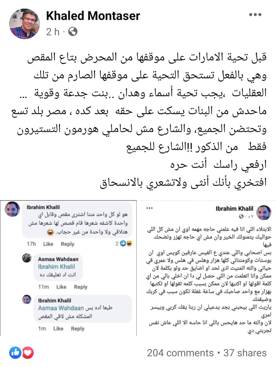 فيما علق الدكتور خالد منتصر، عبر حسابه الخاص على فيس بوك: قبل تحية الإمارات على موقفها من المحرض بتاع المقص وهي بالفعل تستحق التحية على موقفها الصارم من تلك العقليات، يجب تحية أسماء وهدان، بنت جدعة وقوية، ماحدش من البنات يسكت على حقه بعد كده، مصر بلد تسع وتحتضن الجميع، والشارع مش لحاملي هورمون التستيرون فقط من الذكور، الشارع للجميع، ارفعي راسك أنت حرة، افتخري بأنك أنثى ولا تشعري بالانسحاق.