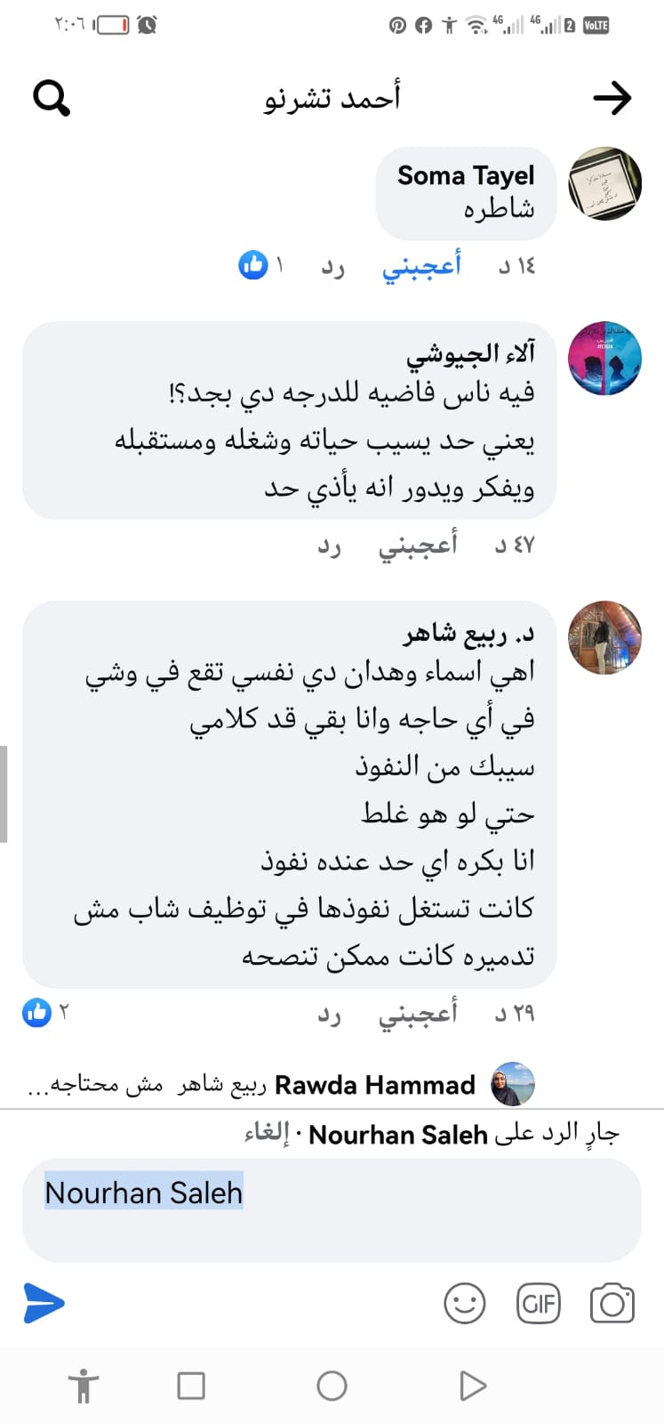 وأكدت وهدان، أن المتهم كتب منشورا أمس، أكد خلاله أنه في كرب، موضحة: الناس كلها ربطت؛ باتخاد إجراء ضده، موضحى أنها لم تتحدث مع المتهم إطلاقًا، ولم تتطرق للنقاش معه، بل اكتفت بكتابة التعليق، ومن ثم اتخاذ الإجراءات القانونية.