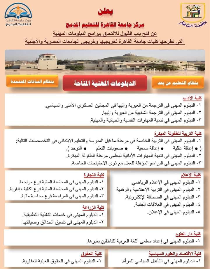 أعلن مركز جامعة القاهرة للتعليم المدمج، فتح باب القبول للالتحاق ببرامج الدبلومات المهنية التي تطرحها الكلية كليات جامعة القاهرة لخريجيها وخريجي الجامعات المصرية والأجنبية.