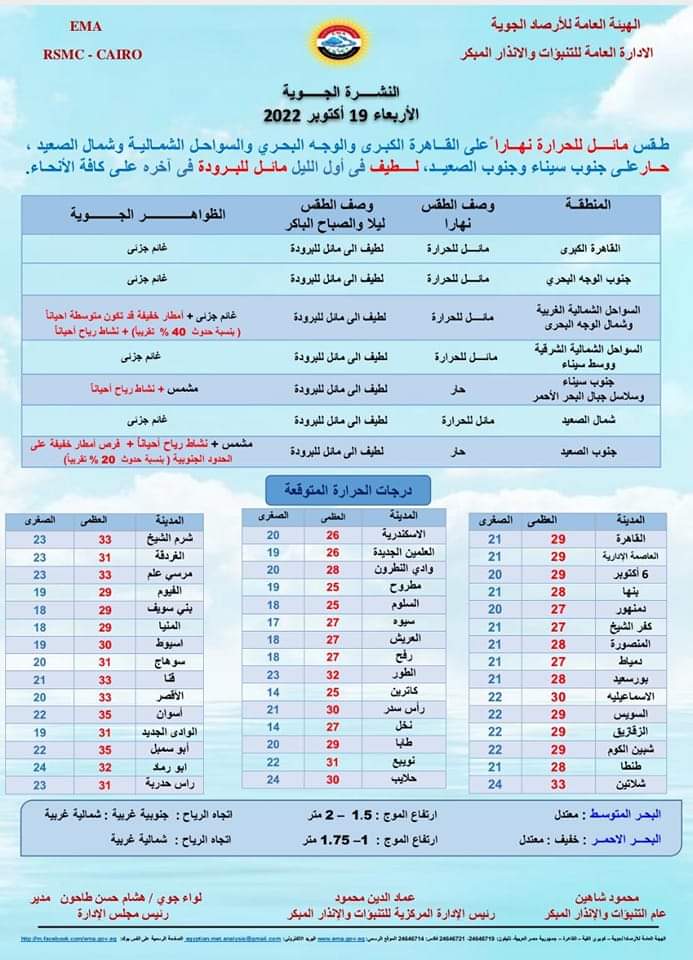 كشفت الهيئة العامة للأرصاد الجوية، تفاصيل حالة الطقس، غدا الأربعاء الموافق 19 أكتوبر عام 2022، حيث يسود البلاد طقس مائل للحرارة نهارًا، على القاهرة الكبرى وجنوب سيناء والوجه البحري وشمال الصعيد والسواحل الشمالية.