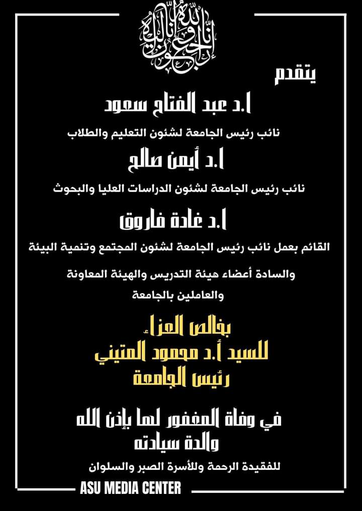وتقدمت جامعة عين شمس في بيان لها، بخالص التعازي للدكتور محمود المتيني رئيس الجامعة، والمواساة في وفاة والدته.