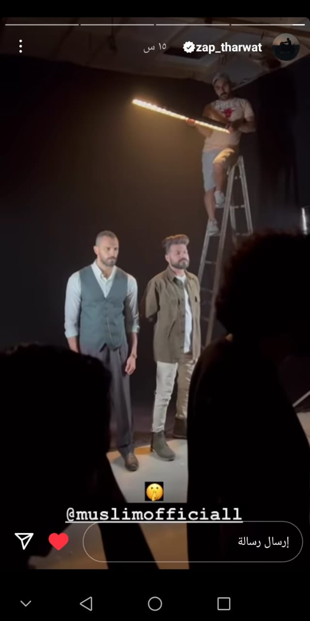 ونشر الفنان زاب ثروت صورة على خاصية الاستوري على حسابه الرسمي على موقع انستجرام من كواليس تصوير أحد أعماله المقبلة، والذي يتعاون فيه مع المطرب مسلم، حيث ظهر في الصورة بصحبته من داخل استديو وحولهم كاميرات وفريق عمل كبير من إضاءات وغيرها.