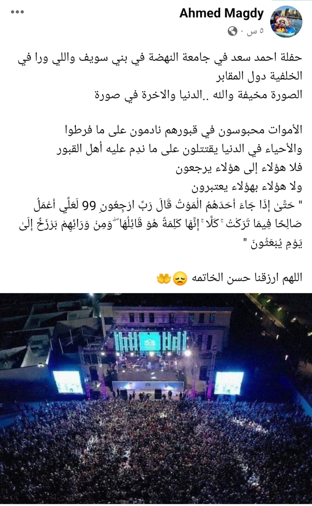وقال أحمد مجدي، في منشور على صفحته الشخصية: حفلة أحمد سعد في جامعة النهضة في بني سويف واللي ورا في الخلفية دول المقابر، الصورة مخيفة والله، الدنيا والاخرة في صورة.
