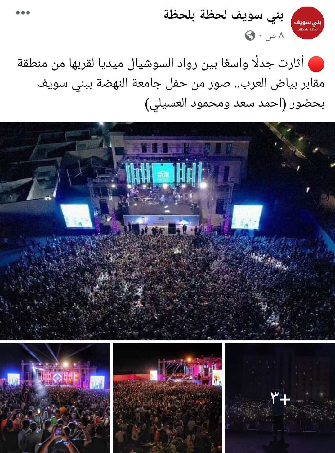 وشهدت مواقع التواصل الاجتماعي حالة من الاستياء والغضب الشديد في محافظة بني سويف، بعد تداول فيديوهات وصور غناء ورقص للطلبة والطالبات بحضور المطربين أحمد سعد والعسيلي في إحدى الجامعات التي يفصلها عن مقابر دفن الموتى بمدينة بني سويف الجديدة سور الجامعة.