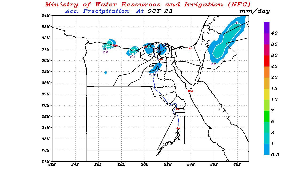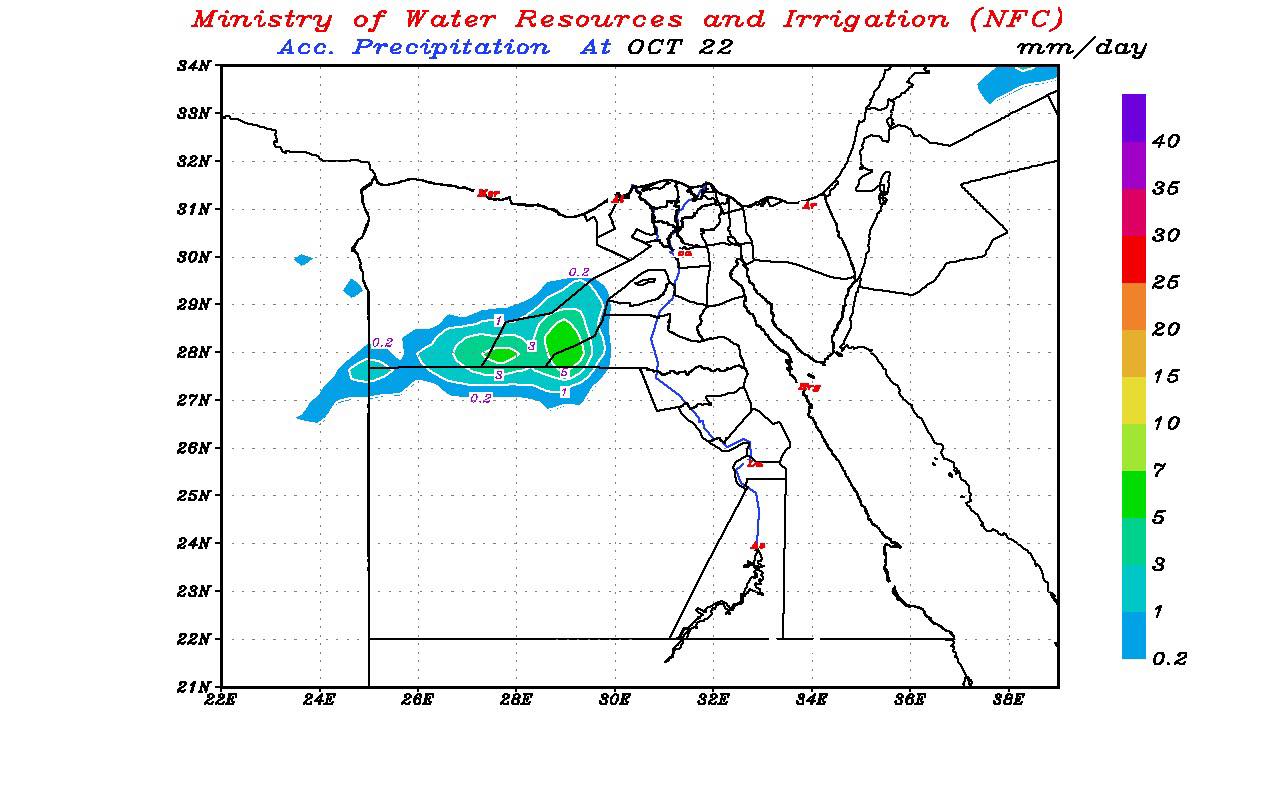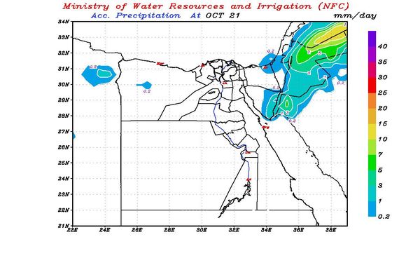 وتوقع مركز التنبؤ بالفيضان، أنه قد تتعرض مناطق من سيناء ومطروح لسقوط أمطار خفيفة، خلال ساعات اليوم الجمعة 21 أكتوبر.