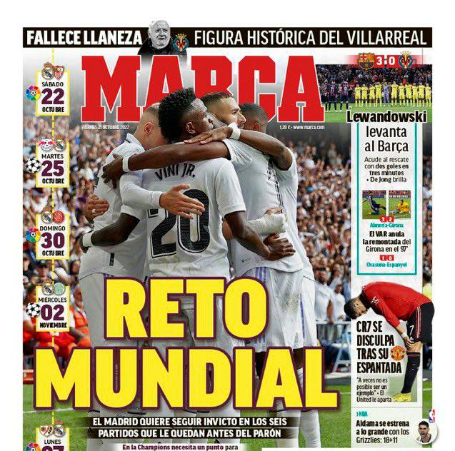 قالت ماركا في غلافها، إن فريق ريال مدريد أمام تحدٍ عالمي في الوقت الحالي، حيث يرغب ريال مدريد باستمرار سلسلة عدم الهزيمة في المباريات الست القادمة قبل كأس العالم، كما أن الميرينجي في دوري أبطال أوروبا يحتاج إلى نقطة ليضمن المركز الأول، أما في الدوري الإسباني لديه 28 من أصل 30 نقطة ويريد تجميع أكبر قدر ممكن نظرًا لعدم معرفة ما قد يحدث بعد كأس العالم.