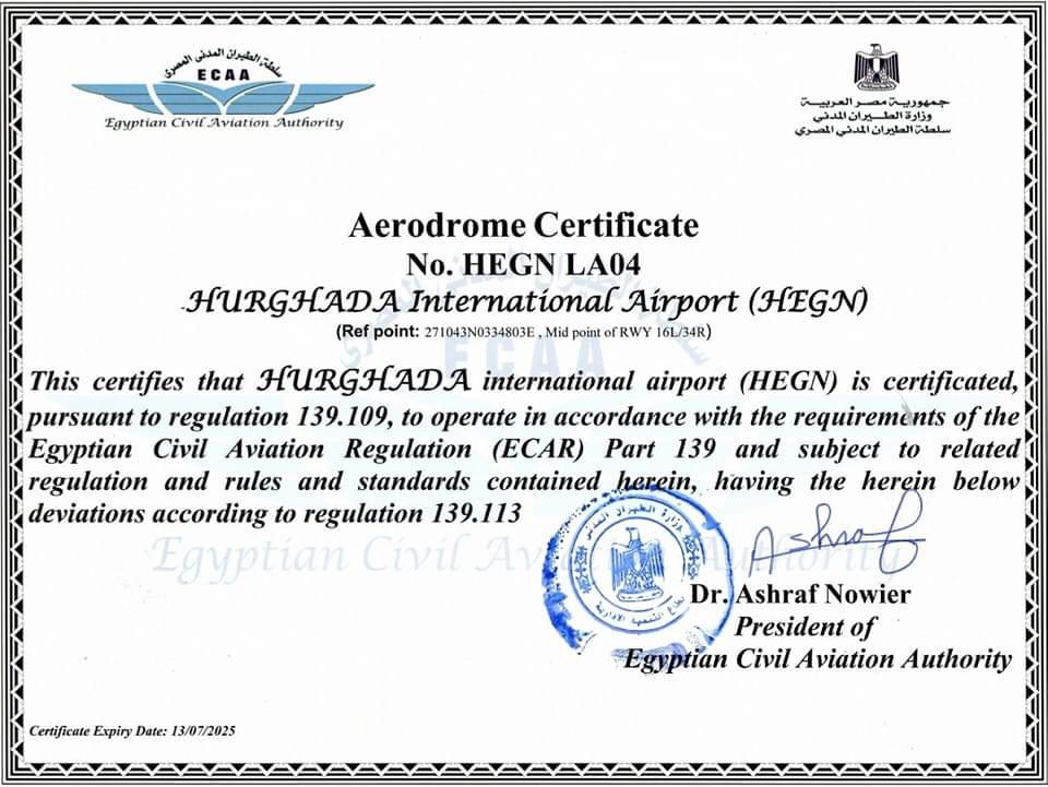 ويعد حصول مطار الغردقة الدولي، على تجديد شهادة ترخيص المطار، إنجازا كبيرا يعكس حرص والتزام جميع العاملين بتطبيق نظام إدارة السلامة SMS وتطبيق القواعد القياسية لتشريعات annex 14 وECAR 139 والتأكيد على وعي جميع العاملين بالمطار بثقافة السلامة وتضافر كافة مجهودات العاملين بالمطار للحفاظ على هذا المستوى تحت إشراف الطيار مراد محمد السيد، مدير المطار، وتوجيهات الطيار أحمد منصور، رئيس مجلس إدارة الشركة المصرية للمطارات والدعم الفني المقدم من قطاع المطابقة والسلامة، برئاسة الطيار خالد عبد السلام رئيس قطاع المطابقة والسلامة.