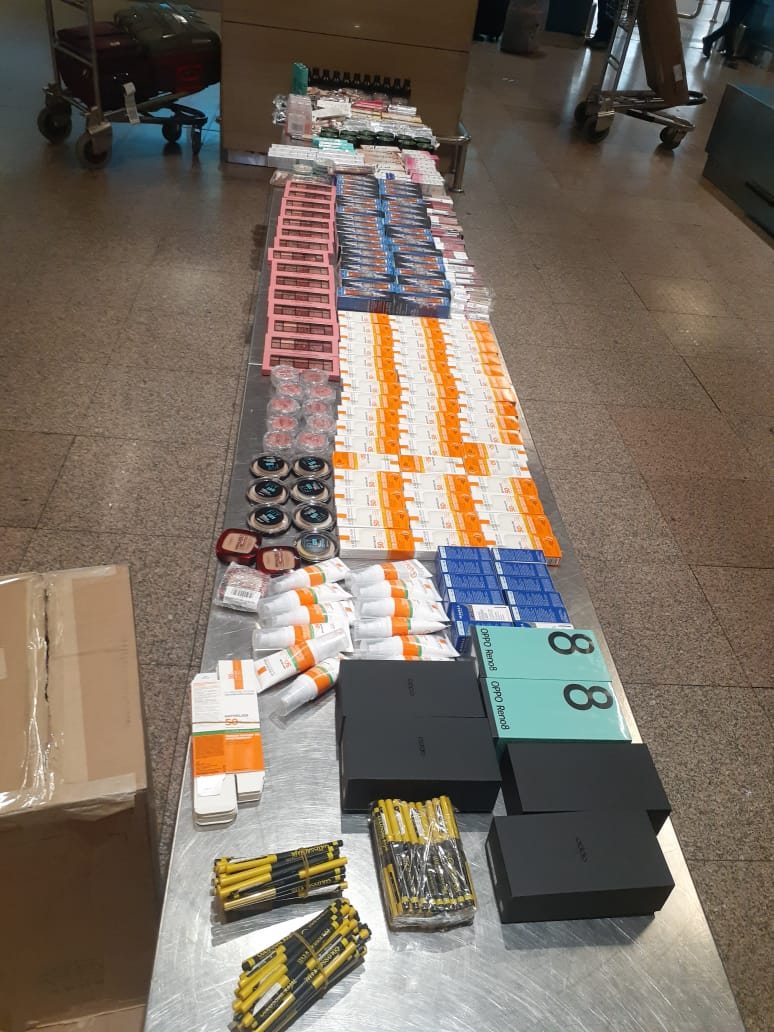أحبطت سلطات جمارك مطار القاهرة الدولي برئاسة الدكتور ماجد موسي المدير العام 5 محاولات تهريب في وقت متزامن لأربعة ركاب حاولوا تهريب هواتف محمولة ثلاثة منهم أسفل الملابس التي يرتدونها وواحد داخل الحقائب، وراكبة حاولت تهريب كمية كبيرة من مستحضرات التجميل.