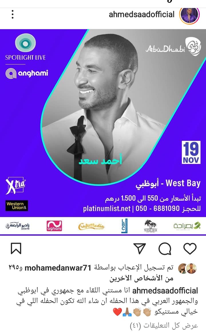 ونشر الفنان أحد سعد البوستر الرسمي لحفله في أبو ظبي عبر صفحته الرسمية على موقع انستجرام وعلق عليها قائلا: أنا مستني اللقاء مع جمهوري في أبوظبي والجمهور العربي في هذه الحفلة إن شاء الله تكون الحفلة اللي في خيالي مستنيكوا.