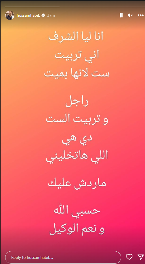 وقال حسام حبيب من خلال خاصية ستوري لحسابه الشخصي على انستجرام، الآتي: أنا ليا الشرف إني تربية ست لأنها بـ 100 راجل، وتربية الست دي هي اللي هاتخليني مردش عليك.. حسبي الله ونعم الوكيل.