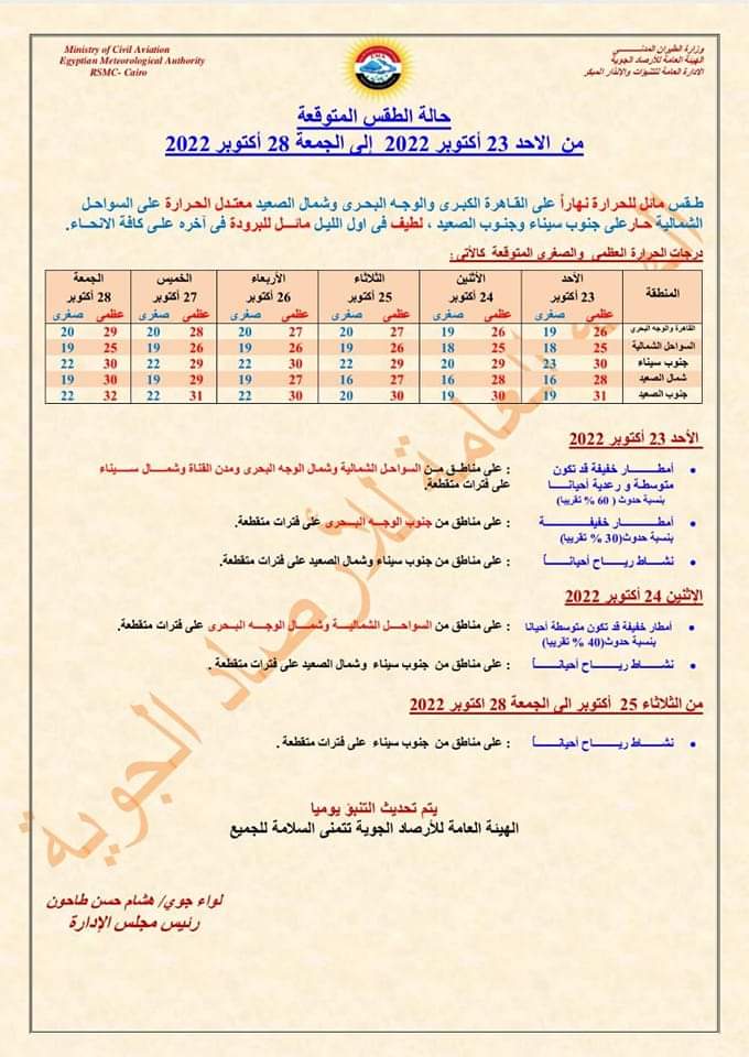 كشفت هيئة الأرصاد الجوية عن حالة الطقس التي تشهدها البلاد خلال الفترة المقبلة، بداية من اليوم الأحد حتى الجمعة، والتي توافق 28 أكتوبر 2022.