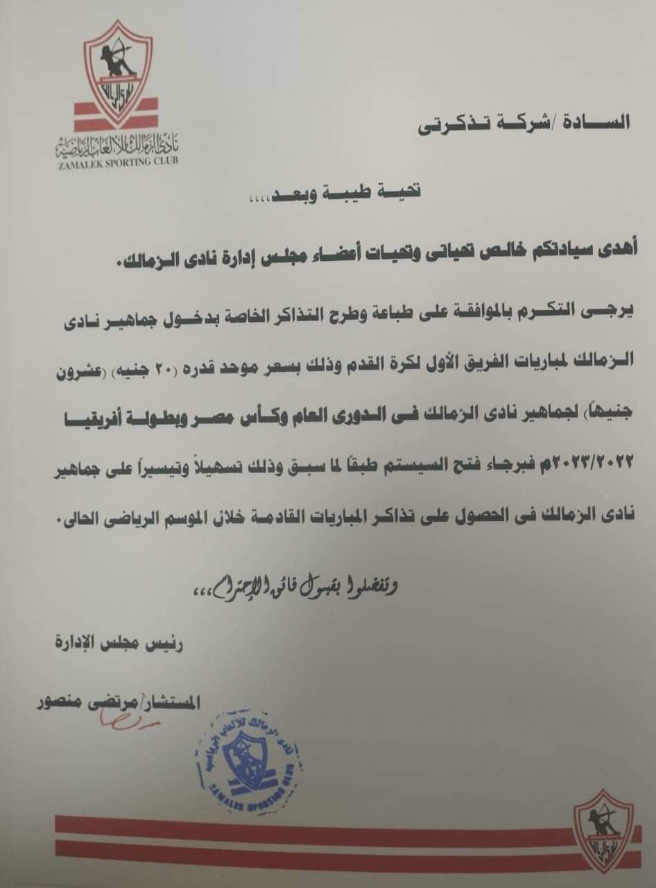 وجاء نص الخطاب كالتالي: السادة شركة تذكرتي.. تحية طيبة وبعد، أهدي سيادتكم خالص تحياتي وتحيات أعضاء مجلس إدارة نادي الزمالك، يرجى التكرم بالموافقة على طباعة وطرح التذاكر الخاصة بدخول جماهير نادي الزمالك لمباريات الفريق الأول لكرة القدم، وذلك بسعر موحد (20 جنيها) لجماهير نادي الزمالك في الدوري العام وكأس مصر وبطولة إفريقيا 2022-2023.