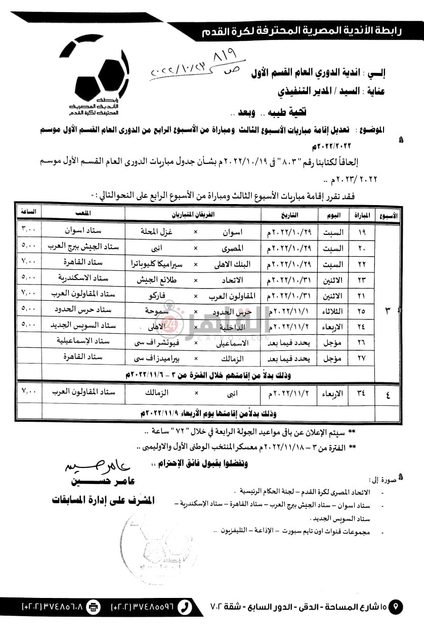 وتضمن خطاب رابطة الأندية للأندية المشاركة في الدوري الممتاز تحديد موعد مباراة وحيدة في الجولة الرابعة للدوري، وهي المباراة التي ستجمع إنبي مع الزمالك يوم 2 نوفمبر، حيث تم تقديم هذه المباراة نظرًا لتأجيل مباراة الفريق الأبيض أمام بيراميدز في الجولة الثالثة لبطولة الدوري الممتاز.