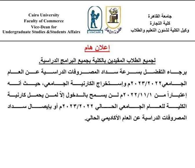 وفي وقت سابق، وجهت كلية التجارة بـ جامعة القاهرة، الطلاب المقيدين بالكلية بجميع البرامج الدراسية بسرعة سداد المصروفات الدراسية واستخراج الكارنيه الجامعي للعام الدراسي الجديد 2022-2023.