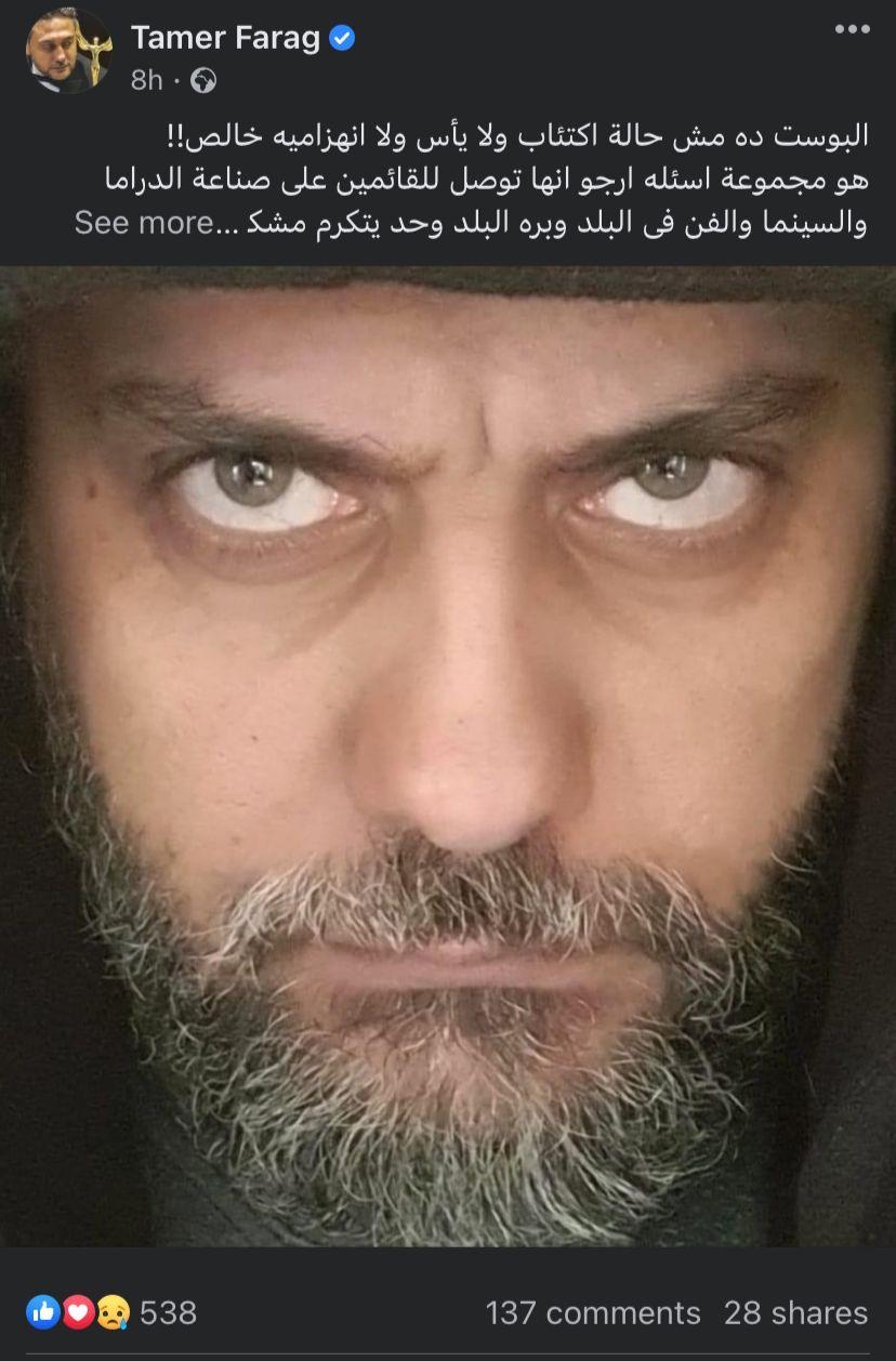 وكتب تامر فرج، منشورًا عبر حسابه الشخصي بموقع التواصل الاجتماعي فيسبوك، حيث قال: البوست ده مش حالة اكتئاب ولا يأس ولا انهزامية خالص.. هو مجموعة أسئلة أرجو أنها توصل للقائمين على صناعة الدراما والسينما والفن في البلد وبره البلد، وحد يتكرم مشكورًا بالرد عليها.
