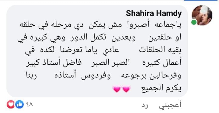 وعلقت الفنانة شهيرة على منشور عبير الشرقاوي، قائلة:: ياجماعة أصبروا مش يمكن دي مرحله في حلقه او حلقتين وبعدين تكمل الدور وهي كبيره في بقية الحلقات عادي ياما تعرضنا لكده في أعمال كتيره الصبر الصبر فاضل أستاذ كبير وفرحانين برجوعه وفردوس أستاذه ربنا يكرم الجميع.
