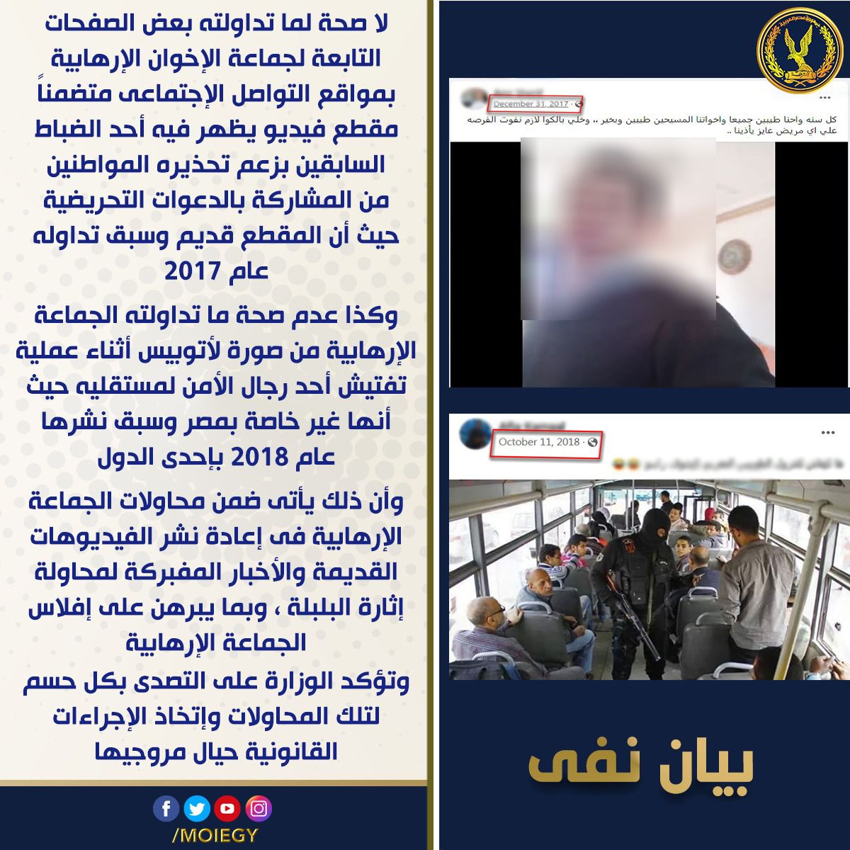 حيث إن المقطع قديم وسبق تداوله عام 2017، وكذا عدم صحة ما تداولته الجماعة الإرهابية من صورة لأتوبيس خلال عملية تفتيش أحد رجال الأمن لمستقليه، حيث إنها غير خاصة بمصر وسبق نشرها عام 2018 بإحدى الدول.