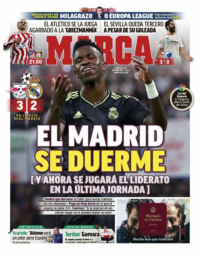 عنونت ماركا في غلافها بـ مدريد يغفو، حيث قالت إن الفريق الميرينجي سيحسم الصدارة في آخر جولة، كما يجب تحقيق الفوز على سلتيك لتجنب الحسابات.