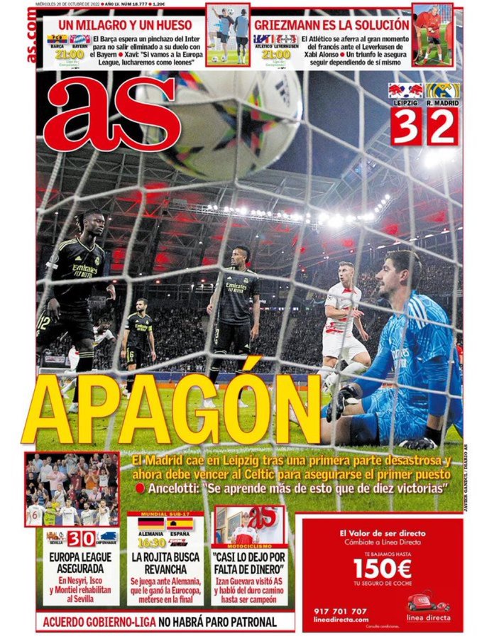 قالت صحيفة آس في غلافها اليوم، إن ريال مدريد يخسر أمام لايبزيج، حيث تنطفئ سلسلة عدم الهزيمة، كما أن أنشيلوتي قال عقب الخسارة: نخسر ونتعلم من أخطائنا خير من أن ننتصر 10 مباريات بأداء هزيل.