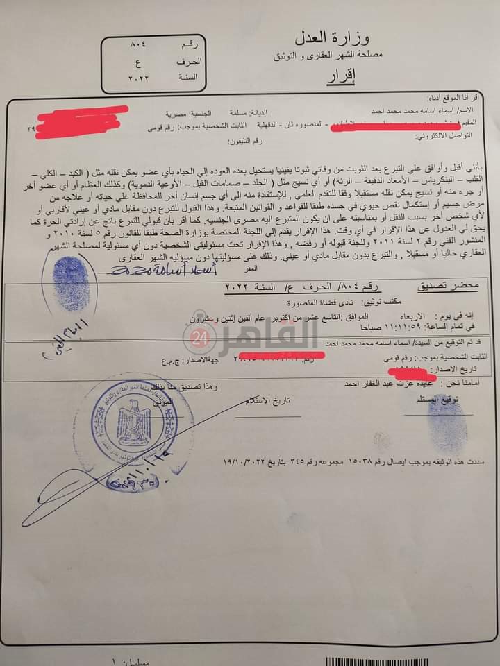 سيدة توثق تبرعها بأعضائها بعد الوفاة في الشهر العقاري: ليه ندفن عضو ممكن يبقى طوق نجاة لأسرة كاملة