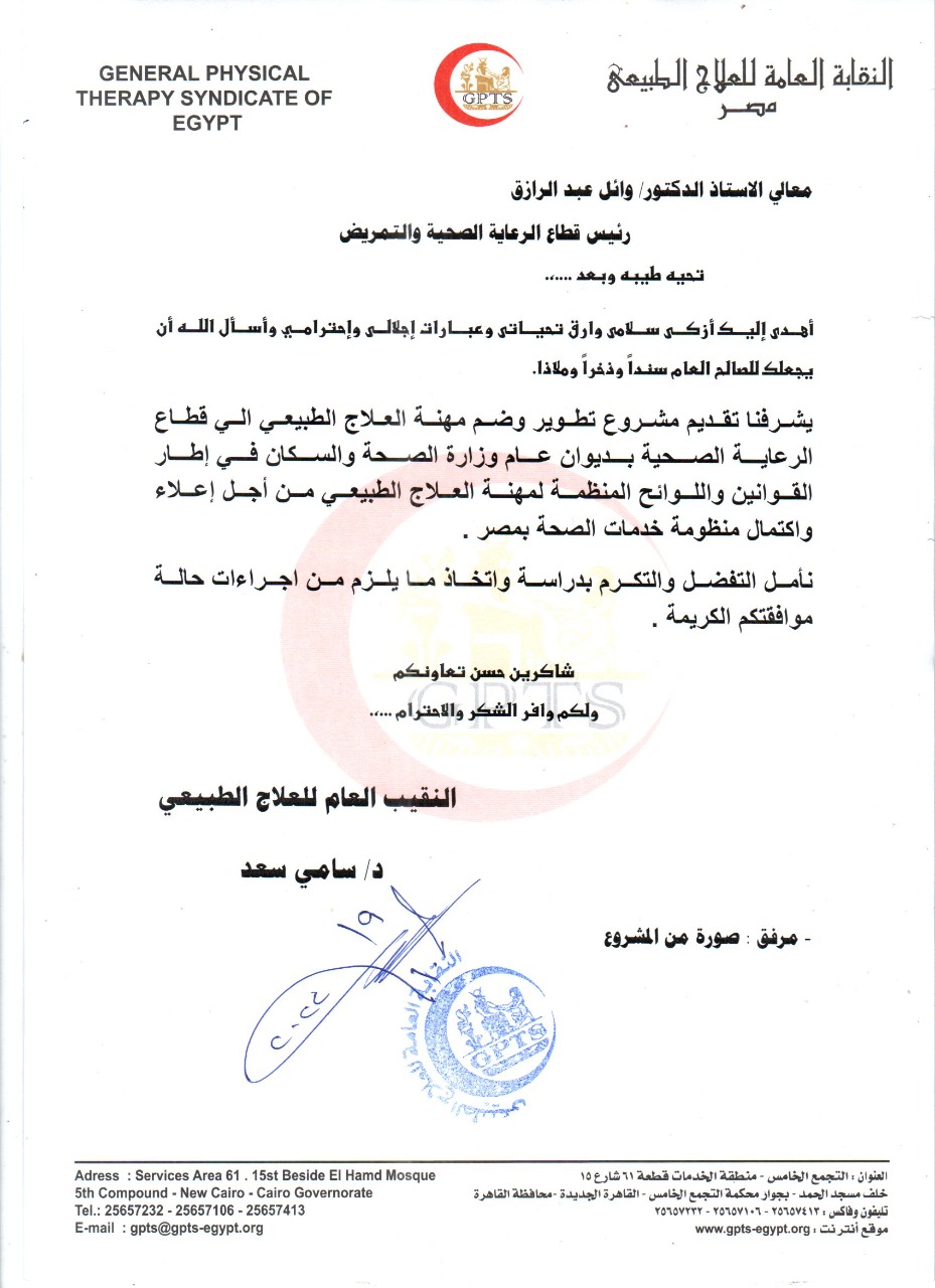 تقدمت النقابة العامة للعلاج الطبيعي، بمشروع تطوير وضم مهنة العلاج الطبيعي إلى قطاع الرعاية الصحية بديوان عام وزارة الصحة والسكان، في إطار القوانين واللوائح المنظمة لمهنة العلاج الطبيعي، من أجل إعلاء واكتمال منظومة خدمات الصحة بمصر.