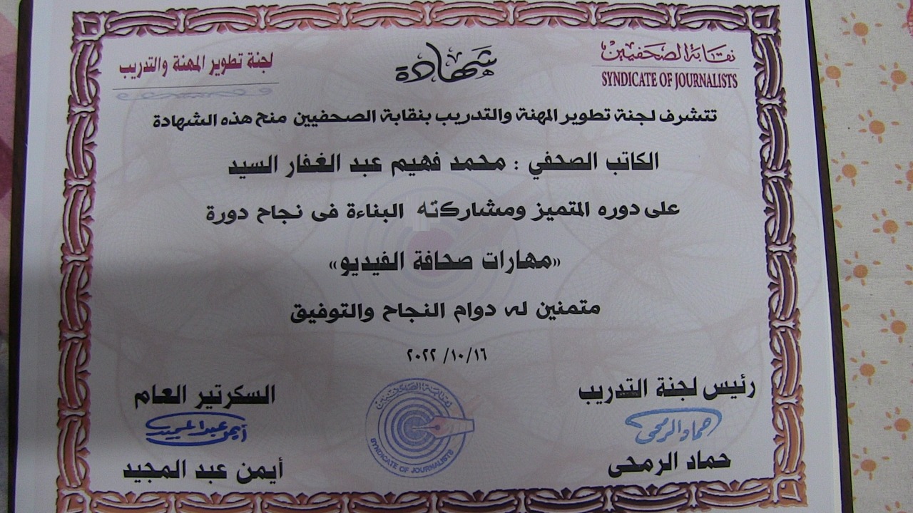 أشرف الزميل محمد فهيم، المدرب المتخصص في تقديم دورات وورش عمل صحفية في مجال صحافة الفيديو، على تقديم أولي الدورات المقدمة في هذا التخصص بنقابة الصحفيين.