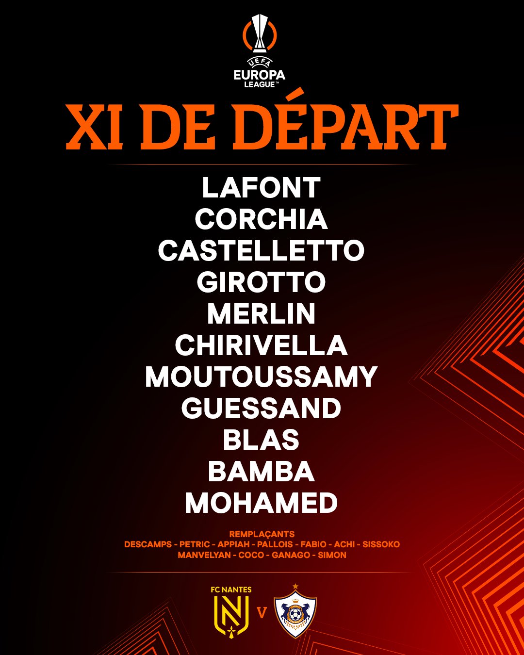 أعلن المدرب أنطوان كومباريه، المدير الفني لفريق نانت، تشكيل فريقه لمواجهة نظيره فريق قره باغ في إطار منافسات مسابقة الدوري الأوروبي.