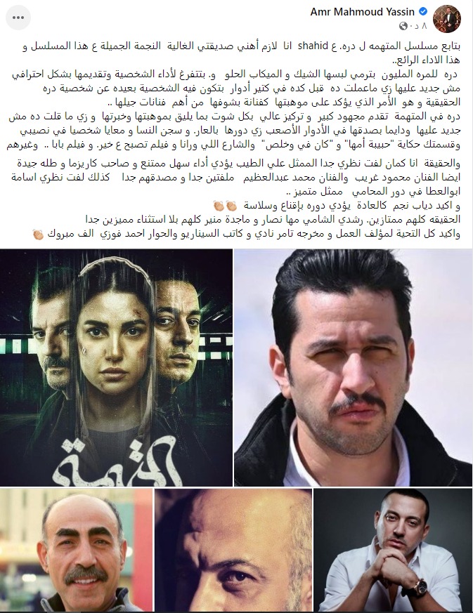 ونشر عمرو محمود ياسين صورًا، لطاقم عمل المسلسل ليهنئهم على نجاحهم، وذلك من خلال حسابه الشخصي بموقع التواصل الاجتماعي، فيس بوك، معلقًا: بتابع مسلسل المتهمة لـ درة، أنا لازم أهنئ صديقتي الغالية النجمة الجميلة على هذا المسلسل، وهذا الأداء الرائع، درة للمرة المليون بترمي لبسها الشيك، والميكاب الحلو، وتتفرغ لأداء الشخصية، وتقديمها بشكل احترافي مش جديد عليها، زي ماعملت ده قبل كده، في كتير أدوار بتكون فيه الشخصية بعيده عن شخصية درة الحقيقية، وهو الأمرالذي يؤكد موهبتها كفنانة، بشوفها من أهم فنانات جيلها.