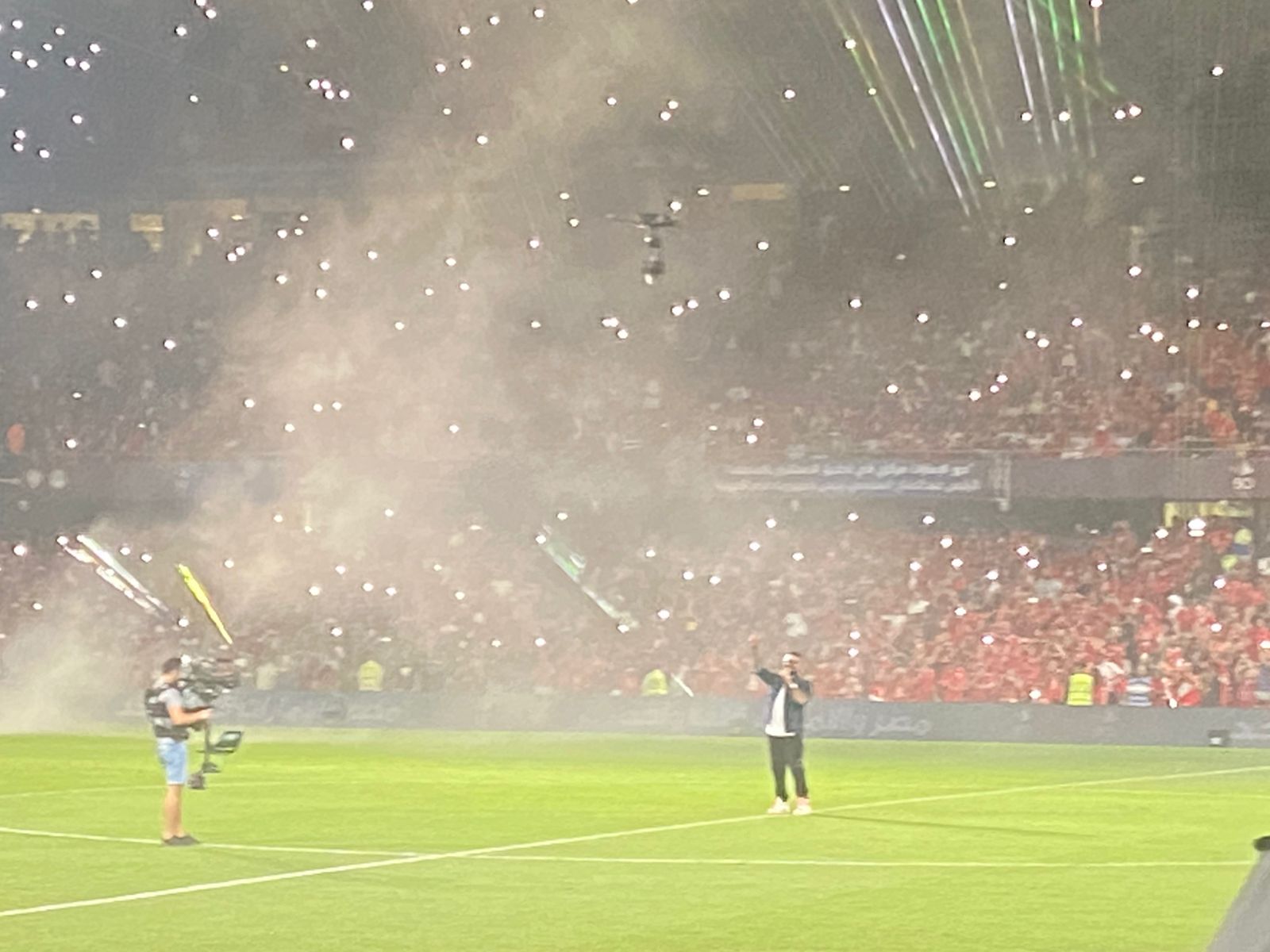 وظهر الفنان أحمد سعد في ملعب المباراة وهو يحيي الجمهور ويتراقص على أنغام أغنيته إيه اليوم الحلو ده مرتديا زي بعيد عن الزي الرياضي فظهر مرتديا الجينز وبليزر كحلي اللون.