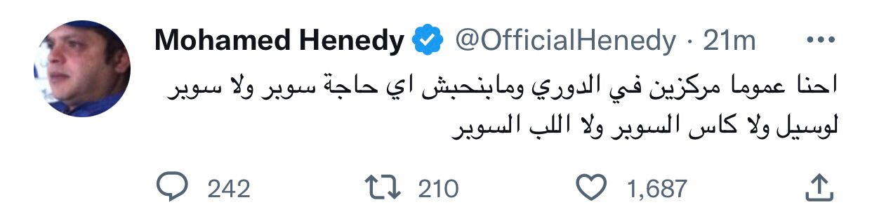 وأضاف هنيدي مازحًا: أحنا عمومًا مركزين في الدوري ومابنحبش أي حاجة سوبر، ولا سوبر لوسيل ولا كأس سوبر ولا اللب السوبر.