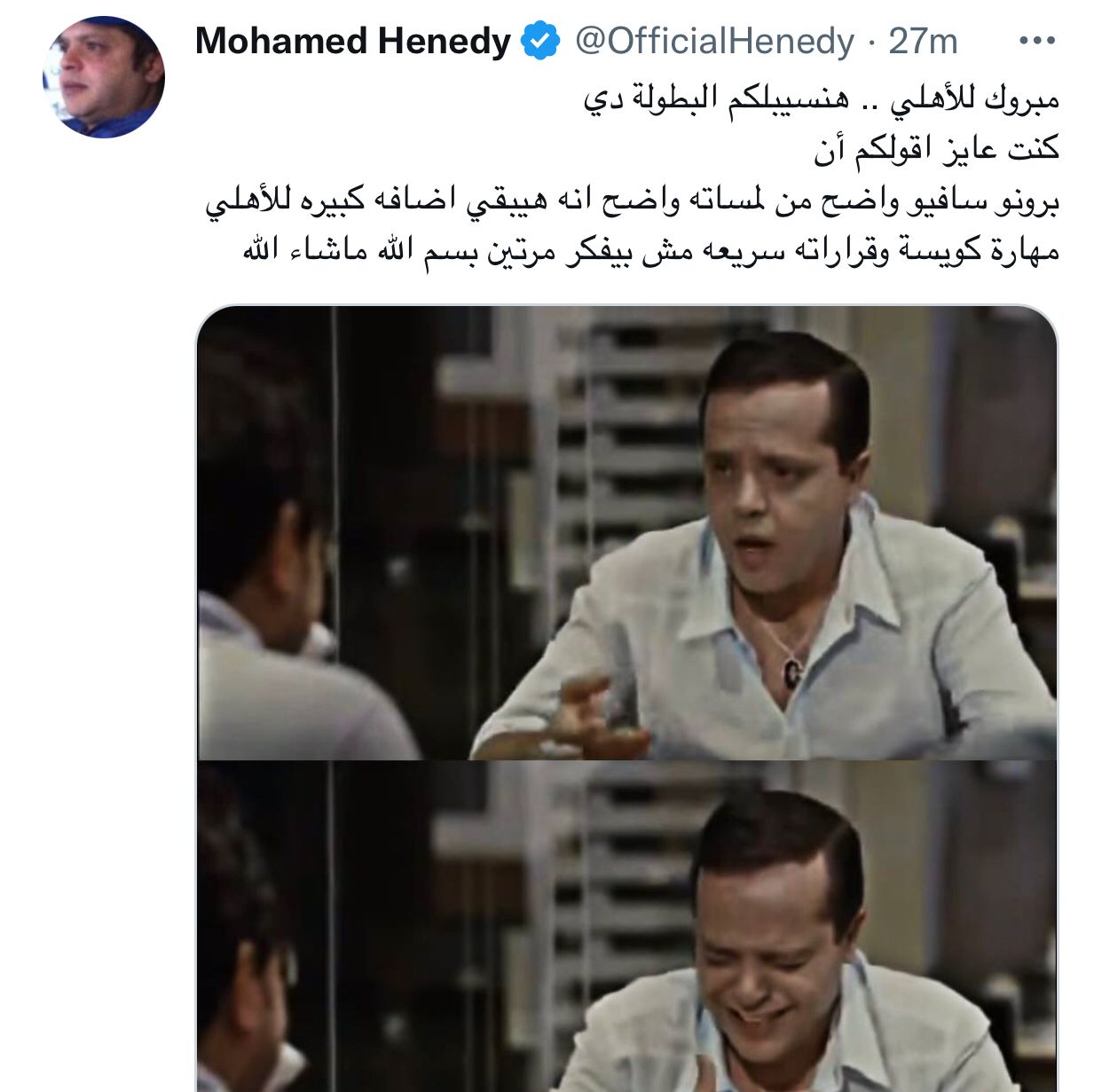 وحرص الفنان محمد هنيدي أن يكون أول المهنئين لمشجعي النادي الأهلي على الرغم من تشجيعه لفريق الزمالك، حيث كتب عبر حسابه بموقع تويتر: مبروك للأهلي هنسيب لكم البطولة المرة دي وكمان عايز أقول لكم إن برونو سافيو واضح من لمساته إنه هيبقى إضافة كبيرة للأهلي، مهارته كويسة وقراراته سريعة ومش بيفكر مرتين بسم الله ما شاء الله عليه.