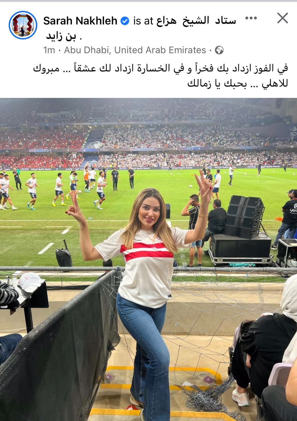 كما هنأت الفنانة سارة نخلة، جماهير النادي الأهلي بفوزه بكأس السوبر المصري بصورة لها من داخل الاستاد، وذلك عبر حسابها على فيسبوك، وعلقت قائلة: في الفوز ازداد بك فخرًا وفي الخسارة ازداد لك عشقًا مبروك للأهلي وبحبك يا زمالك.