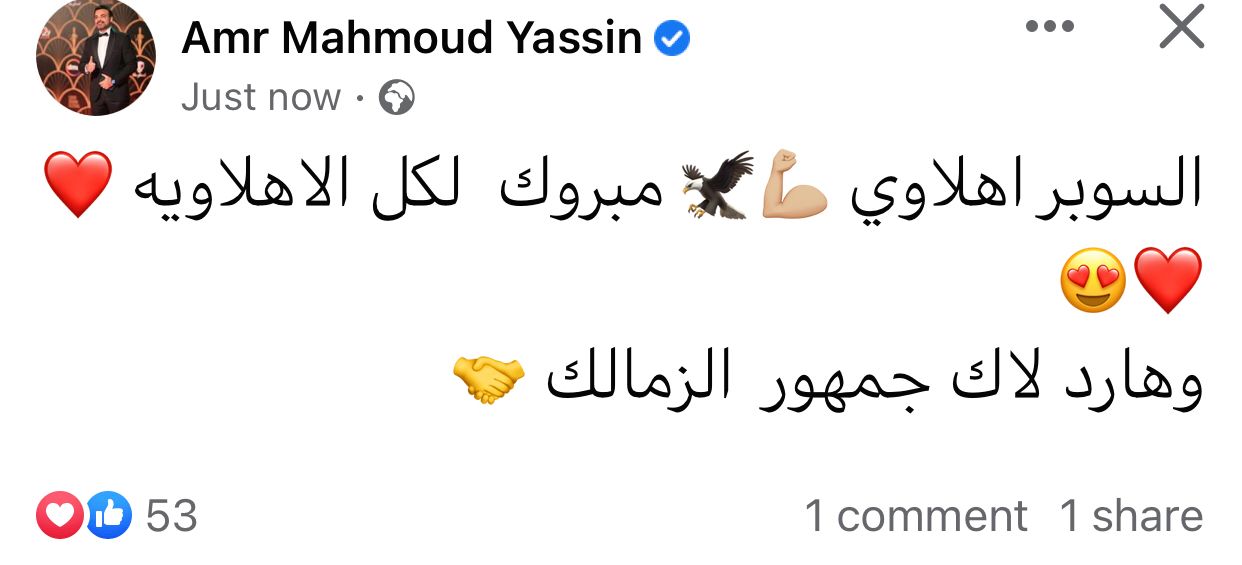 واحتفل السيناريست عمرو محمود ياسين بفوز النادي الأهلي بالسوبر، وكتب عبر حسابه بموقع فيسبوك: السوبر أهلاوي مبروك لكل الأهلاوية وهارد لك جمهور الزمالك.