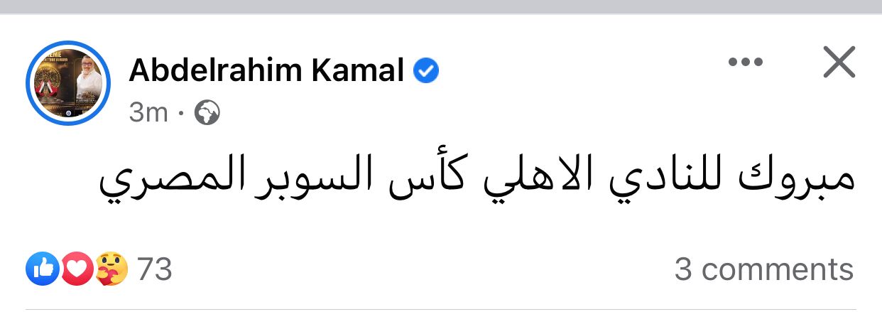 وتفاعل عبد الرحيم كمال بفوز الأهلي، وكتب عبر حسابه بموقع فيسبوك: مبروك للنادي الأهلي كأس السوبر المصري.