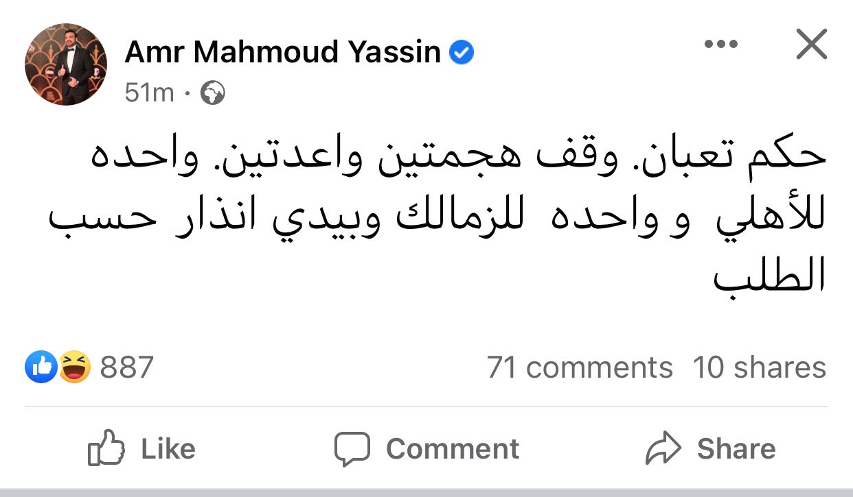 وسبق وأعرب عمرو محمود ياسين عن استيائه من حكم المباراة، وكتب عبر حسابه بموقع فيسبوك: حكم تعبان، وقف هجمتين واعدتين واحدة للأهلي وواحدة للزمالك وبيدي إنذار حسب الطلب.