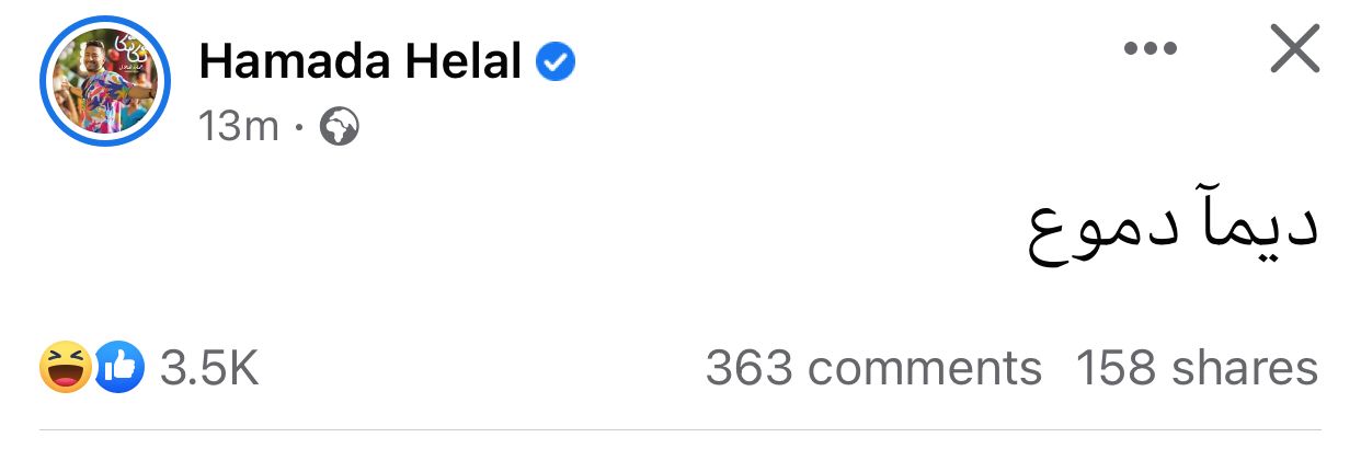 وتفاعل الفنان حمادة هلال مع فوز النادي الأهلي أمام الزمالك اليوم، وكتب عبر حسابه بموقع فيسبوك، مازحًا: دايمًا دموع.
