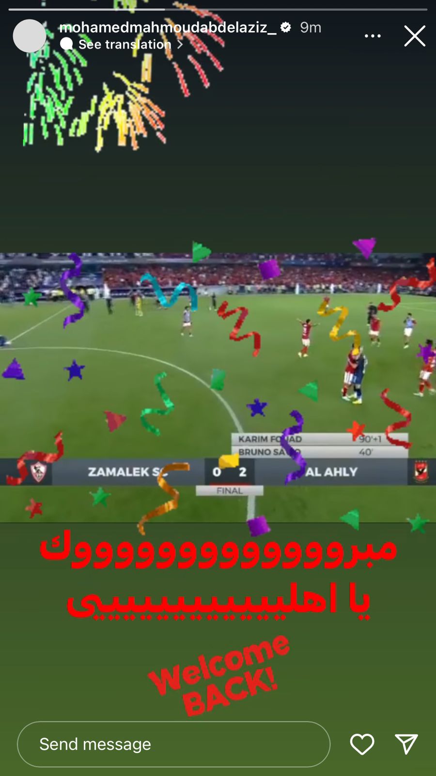 وحرص محمد محمود عبد العزيز على تهنئة جمهور النادي الأهلي، ونشر صورة للاستاد عبر حسابه بموقع انستجرام، وعلق قائلا: مبروك يا أهلي وأهلا بعودتك من جديد.