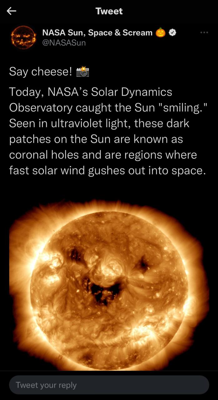 بالطبع الابتسامة التي نراها هنا ليست في الواقع ابتسامة حقيقية، ما ننظر إليه هو الثقوب الإكليلية البقع الداكنة، حيث تتدفق رشقات نارية سريعة من الرياح الشمسية إلى الفضاء كما توضح وكالة ناسا.