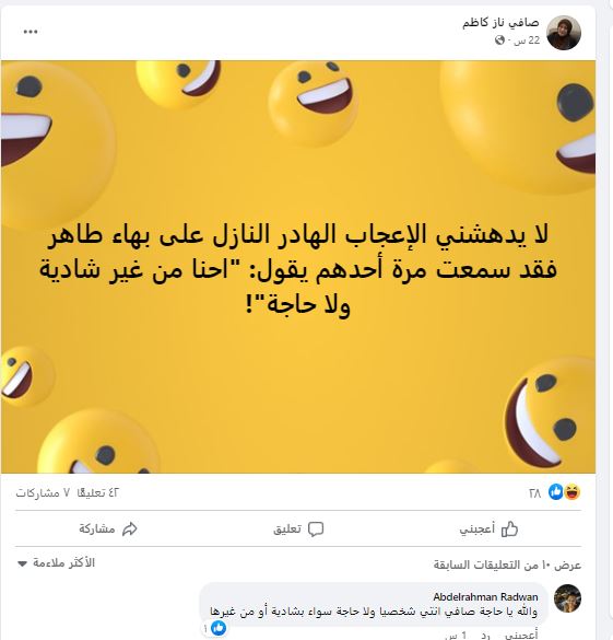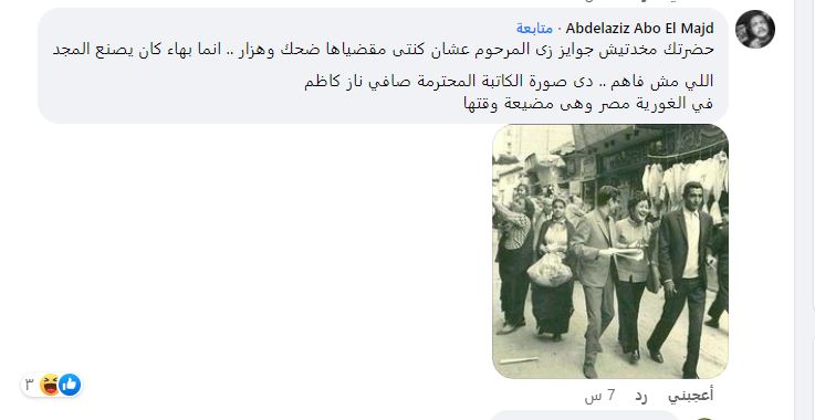 فيما نشر Abdelaziz Abo El Majd صورة صافي ناز كاظم مع محمود دوريش، وعلق عليها قائلا: حضرتك مخدتيش جوايز زى المرحوم عشان كنتى مقضياها ضحك وهزار.. إنما بهاء كان يصنع المجد.. اللي مش فاهم.. دي صورة الكاتبة المحترمة صافي ناز كاظم في الغورية مصر وهى مضيعة وقتها.