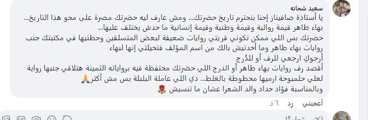 وأضاف سعيد شحاتة: حضرتك بس اللي ممكن تكوني قريتي روايات ضعيفة لبعض المتسلقين وحطتيها في مكتبتك جنب روايات بهاء طاهر وما أخدتيش بالك من اسم المؤلف فتخيلتي إنها لبهاء، أرجوكِ ارجعي للرف أو للدُرج، موضحا: أقصد رف روايات بهاء طاهر أو الدرج اللي حضرتك محتفظة فيه برواياته الثمينة هتلاقي جنبها رواية لعلي حلمبوحة ارميها محطوطة بالغلط.. دي اللي عاملة البلبلة بس مش أكتر.